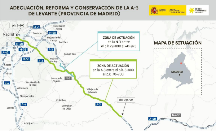 En el caso de la carretera N-3, se actuará principalmente en la rehabilitación del firme y estructuras, además de la actualización de señalización y sistemas de seguridad.